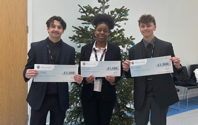 Three Year 13 pupils at Leigh Stationers’ Academy have been awarded grants from the Paper Industry Charitable Trust (PICT) in recognition of their studies in Digital Design and Media and Broadcasting T Levels. All eligible pupils were invited to apply for the grant, with three students selected by the Trust’s board. The successful recipients, Ethan D, Leah M and Oliver C, were presented with their awards during the Woolf College Celebration Assembly on Monday.